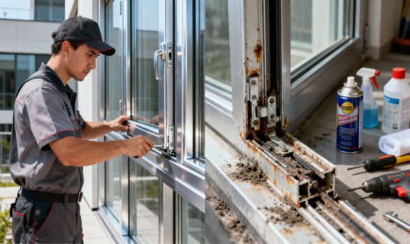 Reparo e regulagem de portas e janelas de alumínio com funcionamento comprometido.